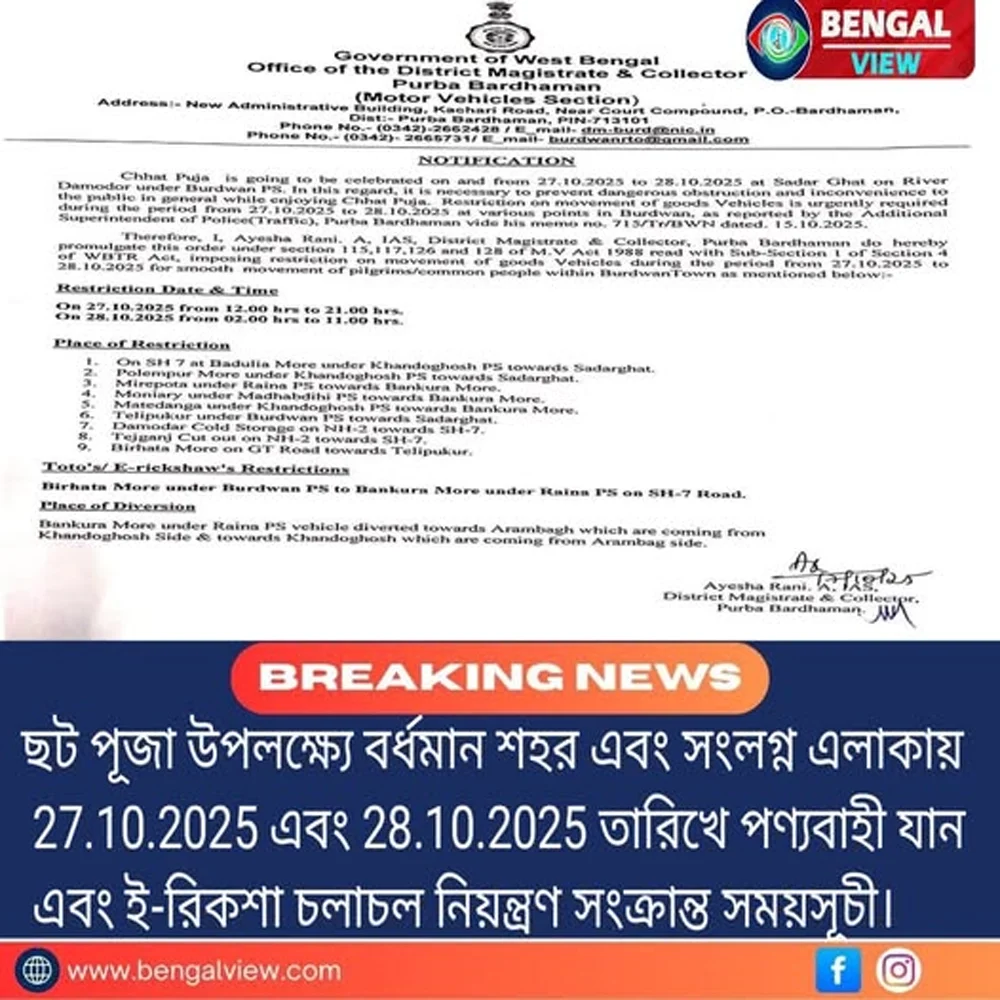 ছট পূজা উপলক্ষ্যে বর্ধমান শহর এবং সংলগ্ন এলাকায় 27.10.2025 এবং 28.10.2025 তারিখে পণ্যবাহী যান এবং ই-রিকশা চলাচল নিয়ন্ত্রণ সংক্রান্ত সময়সূচী।