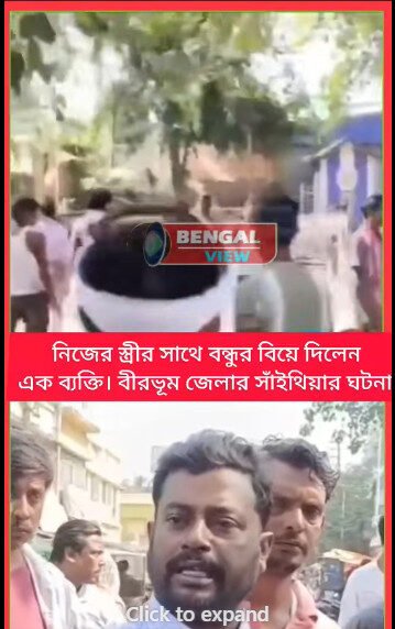 Opinion / Editorialস্ত্রীর প্রেমিকের সাথে বিয়ে দিলেন স্বামী নিজেই বীরভূম জেলার সাঁইথিয়ার ঘটনা। bengal View2 months ago01 mins Post navigation Previous: বিজেপি এমন একটা বিরোধীদল যার কোন লোক নেই বক্তা কল্যাণ ব্যানার্জি।Next: মুকুল রায়ের বিধায়ক পদ খারিজ করল হাই কোর্ট, শুভেন্দু বললেন, ‘ঐতিহাসিক সিদ্ধান্ত’ Leave a Reply Cancel replyYou must be logged in to post a comment.